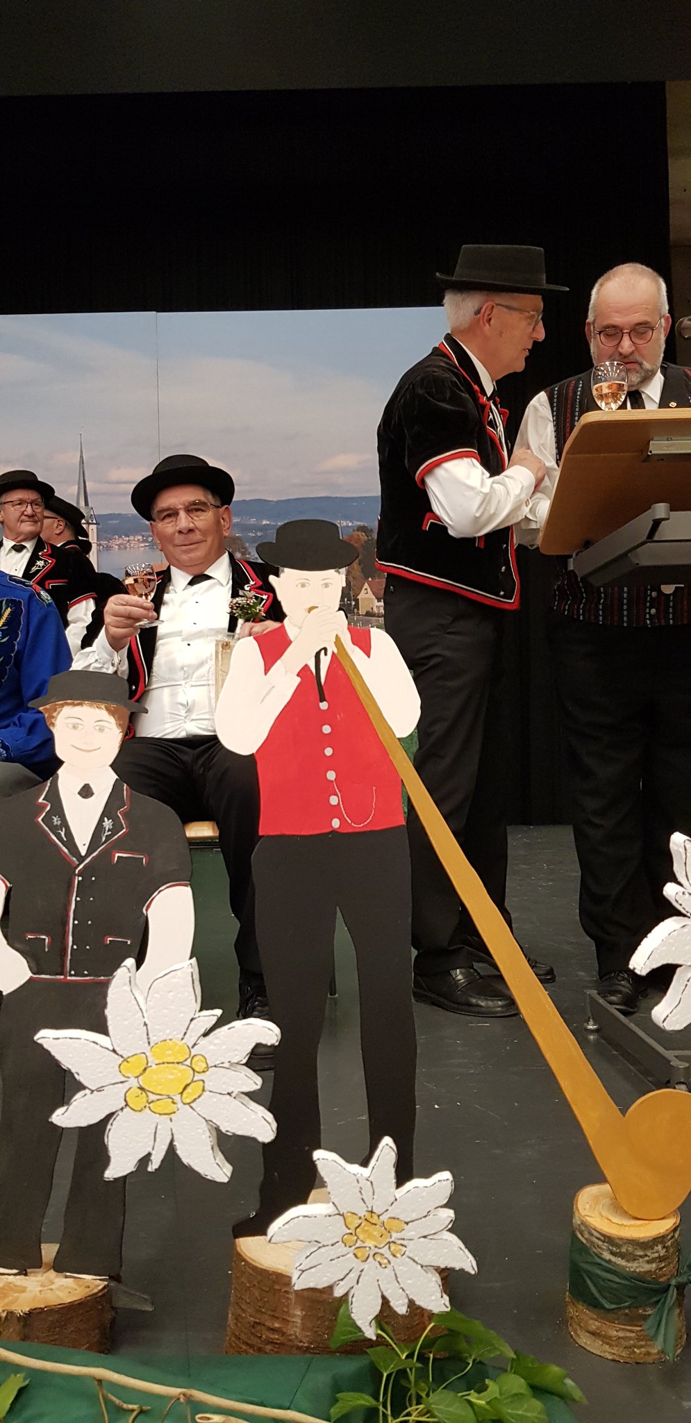 Für einmal durfte er als Zuhörer auf der Bühne sitzend, unseren Stimmen lauschen. Ihm zu Ehren und allen anderen Jubilierenden, gaben wir das Jodellied "E Hand voll Heimatärde" zum Besten.